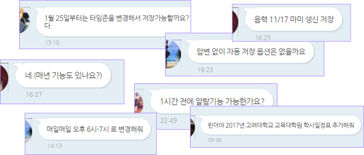 텍스트 입력 시간도 사용자마다 다 제각각이었다. 아침 일과를 시작할 때 일정을 입력하는 사용자들이 있는 반면 하루를 정리하며 다음날 일정을 계획하는 사용자들도 있었다. 밥을 먹다가도, 샤워를 하다가도 옐로아이디 알람이 울리면 컴퓨터로 달려가 응답을 했다. 아무리 상시 대기를 한다 해도 잠은 자야 했기에 결국 자정부터 다음날 아침 8시까지는 옐로 아이디의 자동 응답기능을 활용하여 '잠시만 기다려주세요'를 출력하였다.(물론 잠시는 아니었지만)