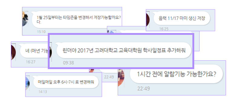 자동응답 API를 통해 챗봇을 제공하기 전, 한 달 동안 수동으로 모든 일정 요청을 응답할 당시 한 사용자로부터 독특한 요청을 하나 받았다. 바로 재학 중인 대학원의 1년 일정을 자신의 캘린더로 넣어달라는 것이었다. 솔직히 요청을 받은 당시에는 이걸 정말 해줘야 하나 고민이 많았다. 단 한 사람을 위해 20개가 넘는 연간 대학원 일정을 캘린더로 담아줘야 한다니. 하지만 실험 당시 우리는 사용자들에게 분명 일정에 관련한 모든 입력을 도와주겠다고 약속했기에 대학원 웹사이트를 찾아 일일이 일정을 옮겨 담아주었다.