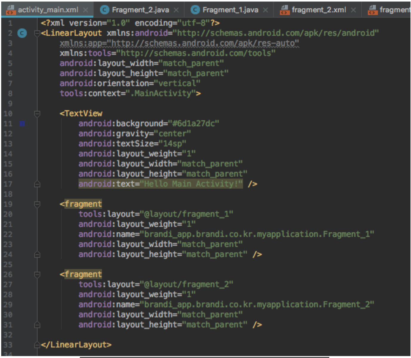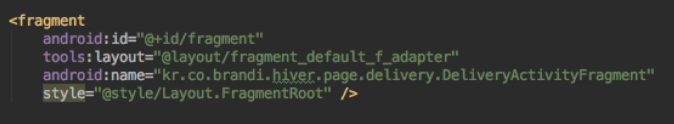 브랜디에서 운영하는 하이버 앱은 위와 비슷하게 설계되어 있습니다. 화면의 기본이 되는 Activity에 실질적인 View를 담당하는 Fragment를 사용합니다. 여기에는 fragment layout이 있죠. 이런 설계 방식은 Activity 영역에선 보통 Toolbar 기능과 Bottom Menu Button을 만들 때 사용합니다. 실질적인 뷰는 Fragment 영역에서 보여주죠.