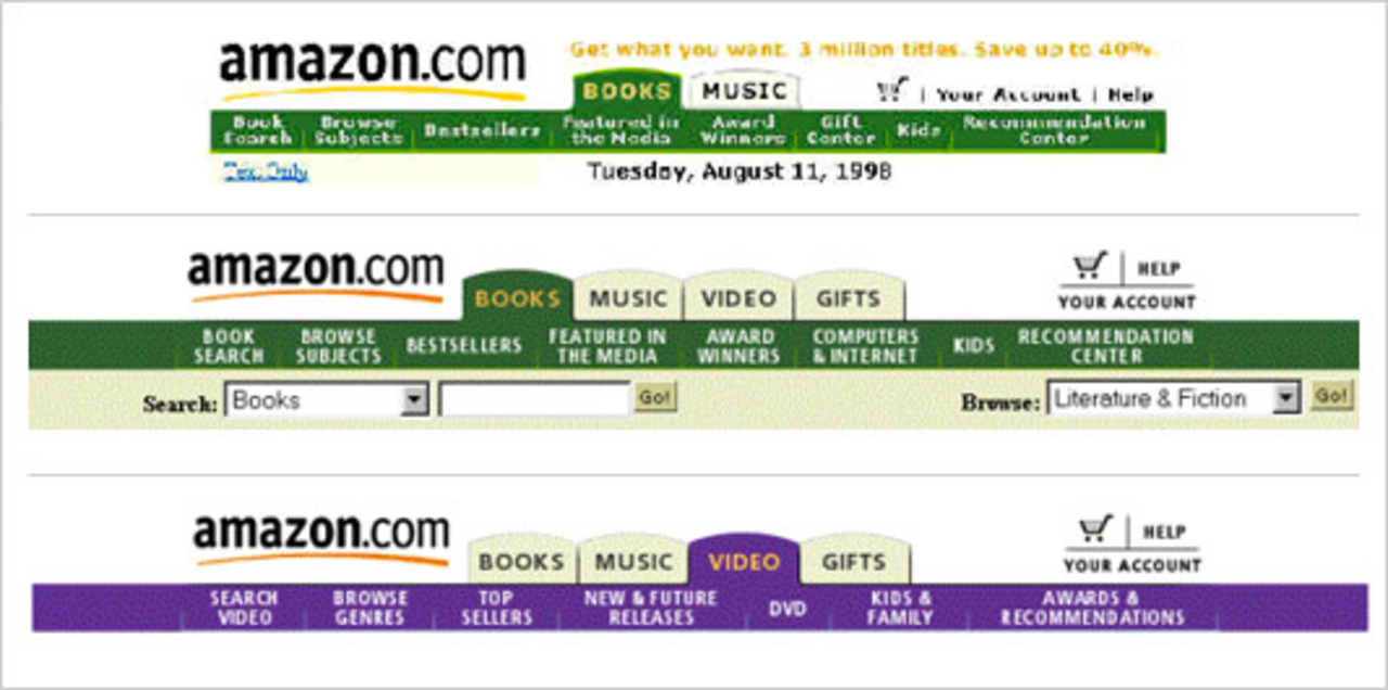 커머스의 경우 제품이나 서비스 등이 변경, 추가되면서 GNB가 달라지게 됩니다. 그 예로 아마존 웹사이트의 탭 내비게이션 디자인의 변화를 보면 아마존의 제품, 서비스가 어떻게 달라졌는지 한눈에 확인할 수 있습니다.