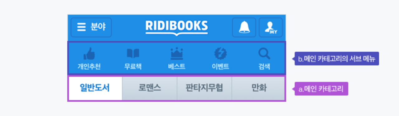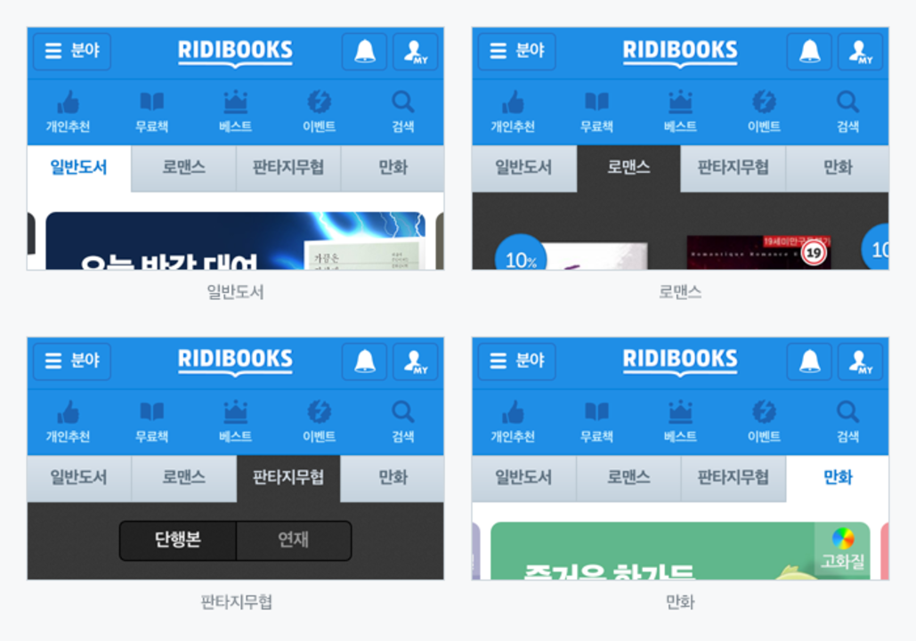 리디북스 서점의 경우, 최근 몇 년간 GNB에 큰 변화는 없었습니다. 그런데 이번에 GNB 개편을 하게 된 이유는 판타지 연재 서비스를 준비하면서 ‘판타지’ 서브 메뉴로 ‘연재’를 추가하기 위한 작업이 필요했기 때문입니다. 이번 작업을 하면서 GNB의 사용성과 디자인 완성도를 위해 고민했던 그 과정을 공유합니다.