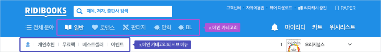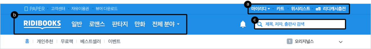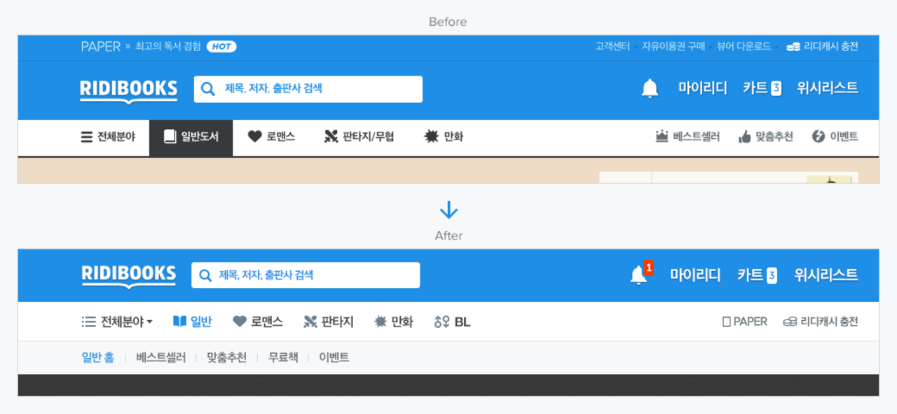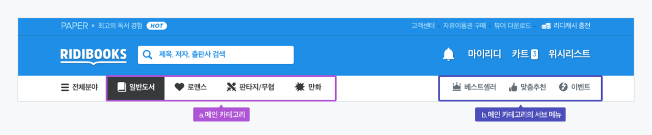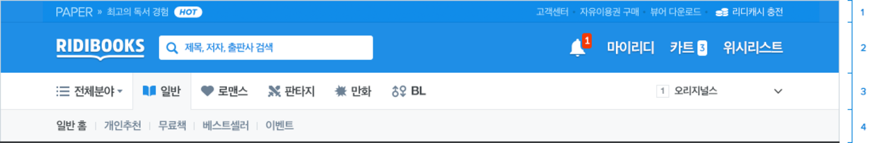 하지만 일반적인 레이아웃을 리디북스 서점에 적용할 경우 a) 마이리디, 카트, 위시리스트 크기가 작아지고 위치가 이동하여 사용이 불편해지고 b) 로고, 메인 카테고리, c) 검색창을 한 공간에 배치하기가 어려웠습니다.