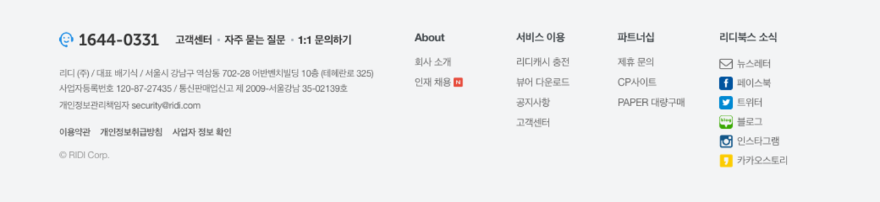 그런데 가운데 단 우측에 메뉴가 4개가 있다 보니 복잡해 보였습니다. 또 하나의 문제점은 PAPER는 리디북스 서점이 아닌 PAPER샵으로 이동하는 메뉴이고, 고객센터 / 뷰어 다운로드 / 리디캐시 충전은 리디북스 서점 페이지인데 같이 나열되는 것이 사용자에게 혼란을 줄 수 있다고 생각했습니다.
