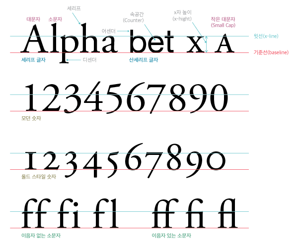 글자들이 고르게 놓인 것처럼 보이는 선을 기준선, Baseline이라고 합니다. 소문자들의 몸통을 고르게 놓는 기준선 위의 선은 윗선 x-line, 혹은 몸통선Meanline 이라고 부릅니다. 소문자 x의 획이 보통 기준선에서 윗선까지 닿기 때문입니다. p나 h같이 x보다 위아래로 뻗는 소문자 획은 각각 위쪽이 어센더Ascender, 아래쪽이 디센더Descender입니다. 속공간Counter은 글자의 획이 둥글게 공간을 싸고 있는 경우인 d, e, g등의 빈 공간을 말합니다.