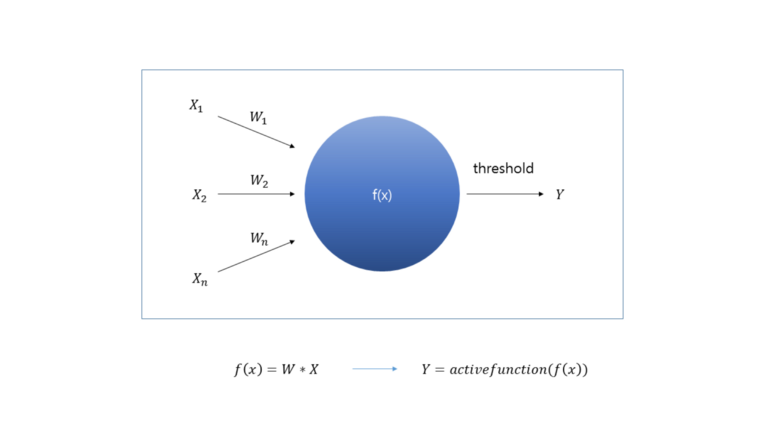 입력값들(X)에 가중치를 두어(W) 값(f(x))을 구하고 그 값과 임계치와의 관계를 활성함수(active function)로 판단하여 결과값을 출력하는 것입니다.