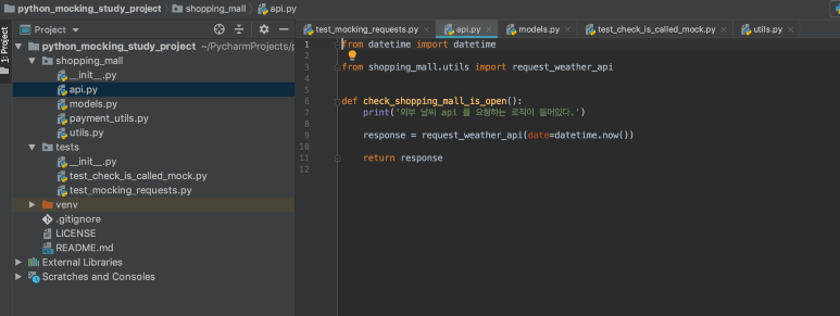 # 이녀석이 mocking 타겟 from shopping_mall.utils import request_weather_api def check_shopping_mall_weather(): print('외부 날씨 api 를 요청하는 로직이 들어있다.') response = request_weather_api(date=datetime.now()) return response