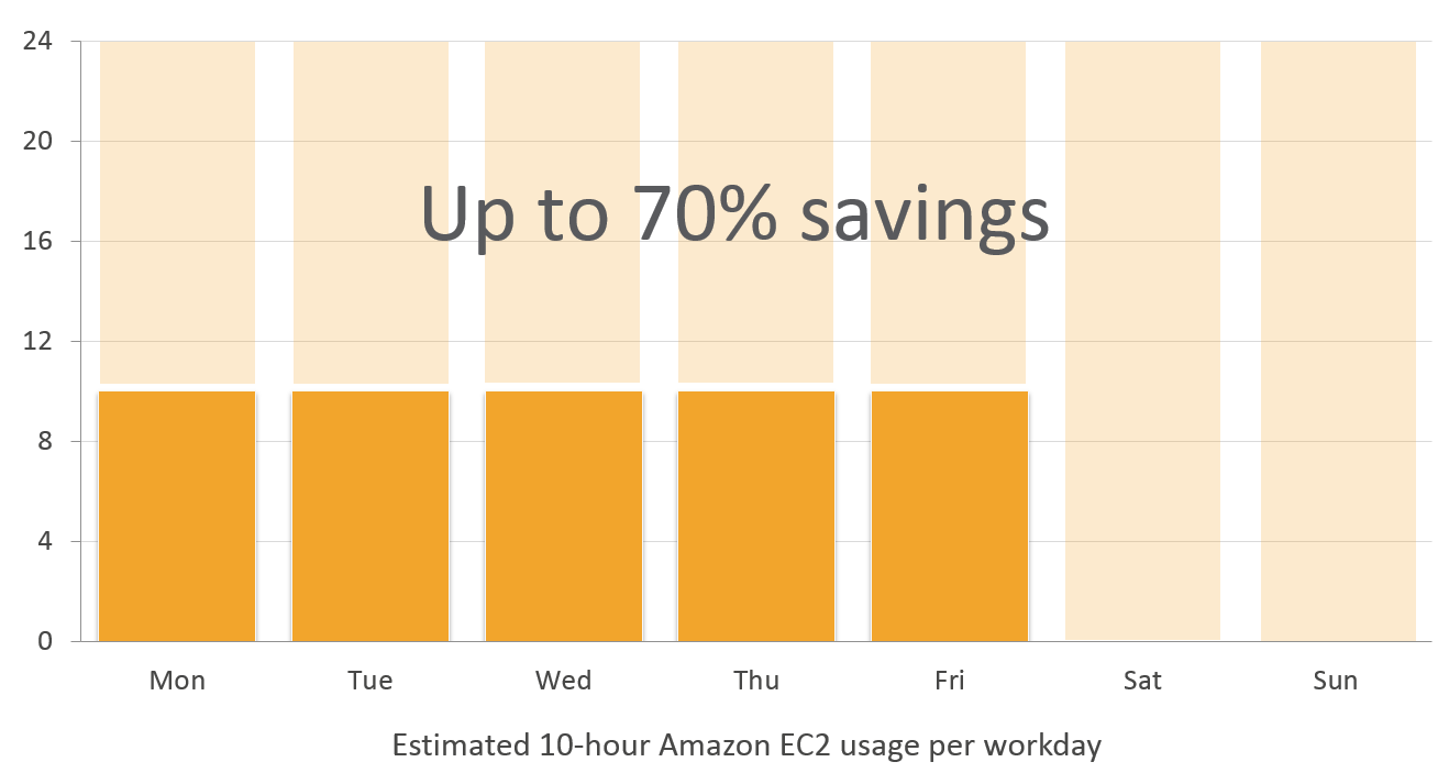 AWS는 이러한 원성(?)을 들었는지 EC2 Scheduler 라는 간단한 솔루션을 소개했습니다. 내용을 보면 설정된 시간과 요일에 자동으로 EC2 인스턴스가 자동으로 켜지고 꺼집니다. 하루 10시간 가용한다면 주말 제외 월~금요일만 작동시켜 비용을 70%나 절감할 수 있습니다.