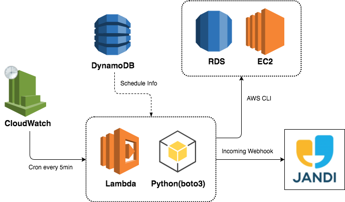 Cloudwatch Event를 이용하여 Lambda를 함수를 실행시키고 Dynamo DB에 저장된 스케쥴 정보와 Instance의 Tag 값을 기반으로 RDS와 EC2를 조회하고 Instance를 시작하거나 중지합니다. 그리고 JANDI의 Incoming Webhook을 이용하여 토픽에 알림 메시지를 보내줍니다.