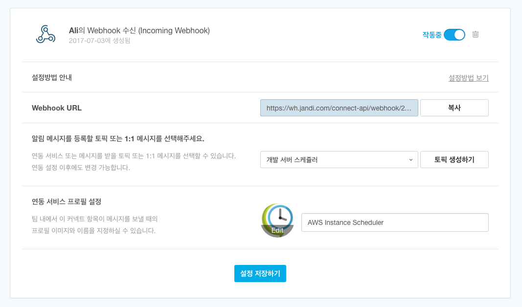 Instance Scheduler는 JANDI 메신저의 Incoming Wehbook 을 이용하여 Webhook URL을 Lambda의 환경 변수에 설정하면 서버의 시작과 중지에 대한 알람과 중지 10분 전부터 곧 서버가 중지된다는 알람을 발송하여 필요하다면 서버 중지 시간을 연장할 수 있도록 합니다.