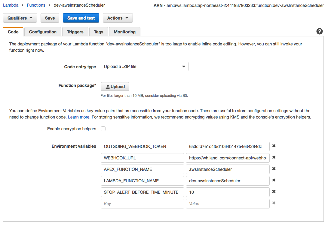 배포된 Lambda 함수의 Code 탭에서 Environment variables에 WEBHOOK_URL을 설정하거나 function.json에서 변경 후 재배포 하여도 됩니다.