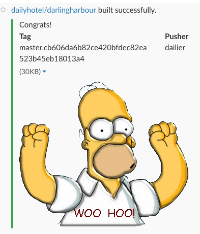 docker run — env SLACK_URL=’https://hooks.slack.com/services/PUT/YOURS/HERE' — env RELAY_PORT=8080 — env=DEFAULT_CHANNEL=’#dev’ — env=IMAGE_URL=’https://i.giphy.com/LYDNZAzOqrez6.gif' -p 8080:8080 dailyhotel/relay
