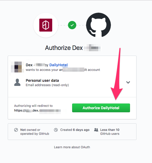 - 0.0.0.0/0staticClients / example-app는 Dex에 포함된 예제 프로그램이다. 이를 이용하면 웹 브라우저를 통해 GitHub에 인증하고 토큰을 내려받을 수 있다. DailyHotel/kid 등의 도커 이미지를 사용하면 쉽게 띄울 수 있다. kube-aws는 이 예제 프로그램을 띄우지 않기 때문에 직접 올려야 한다.