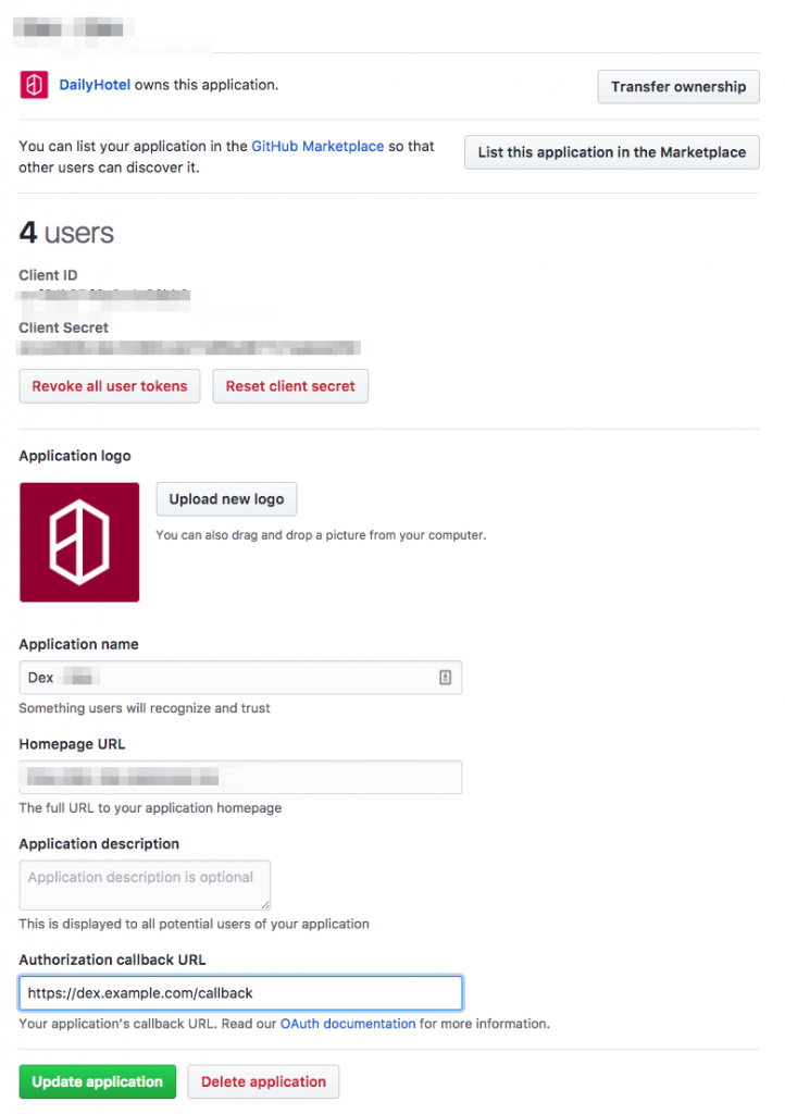 # userID: "08a8684b-db88-4b73-90a9-3cd1661f5466"우선 GitHub의 Organization Settings 메뉴로 가서 OAuth Apps에 Dex를 추가한다. 이때 Authorization calllback URL은 https://dex.example.com/callback가 된다.