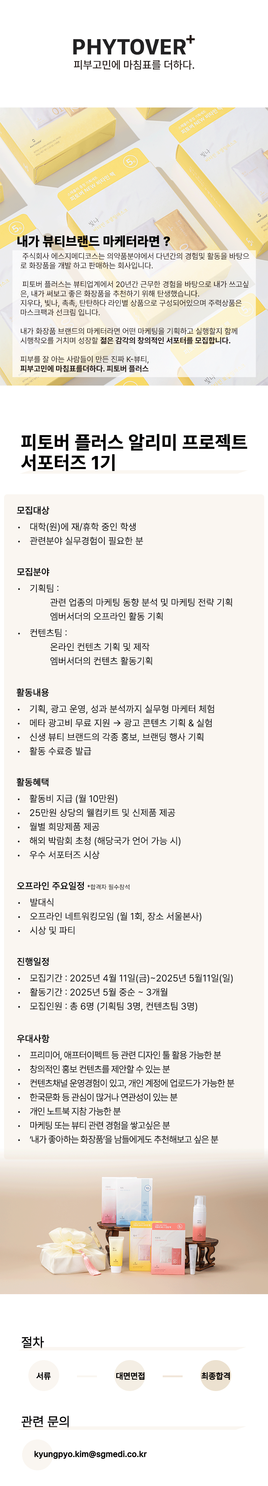 피토버 플러스 알리미 프로젝트, 서포터즈 1기 모집주식회사 에스지메디코스는 피부 관련 의약품 분야에서 다년간의 경험 및 활동을 바탕으로 화장품을 개발하고 판매하는 회사입니다.