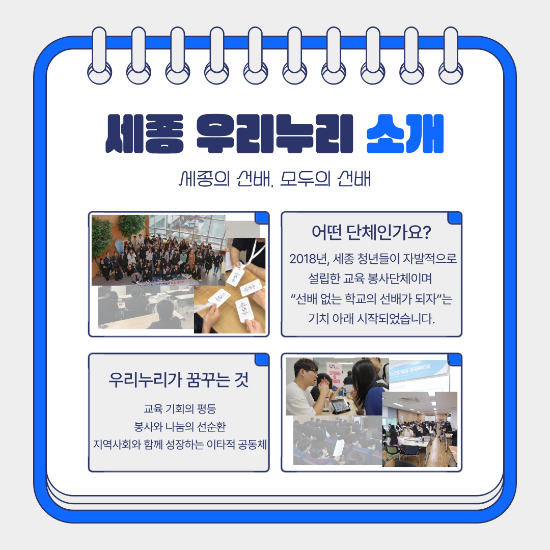 세종 우리누리는 2018년에 세종 청년들이 자발적으로 설립한 교육봉사단체이며, "선배 없는 학교의 선배가 되자"는 기치 아래 시작했습니다. 세종시 내의 중, 고등학생 멘토링을 주로 진행하고 있으며, 현재 다양한 대학 소속의 멘토들이 활동 중입니다. 🎓