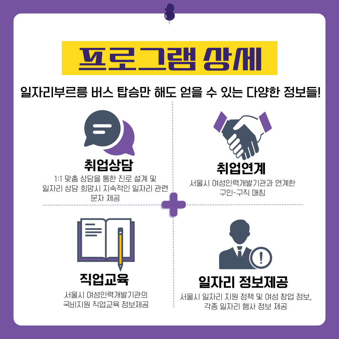 - 진로와 취업을 여정을 시작하는 여성 청년들을 위해, 1:1 취업상담과 진로 설계, 취업연계 등을 한 자리에서 지원하는 프로그램