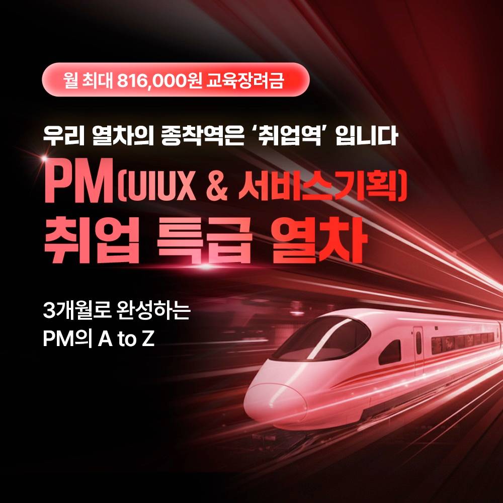 [전국/무료] 서비스 기획부터 UI/UX까지, PM 취업 특급 열차 지금 출발합니다!실제 현업에서 쓰이는 서비스 기획 툴과 데이터 분석 방법론을 활용해 16주간 PM 실무 전 과정을 배우고, 프로젝트와 멘토링을 통해 실무 기획 역량과 취업 경쟁력을 완성할 수 있습니다.