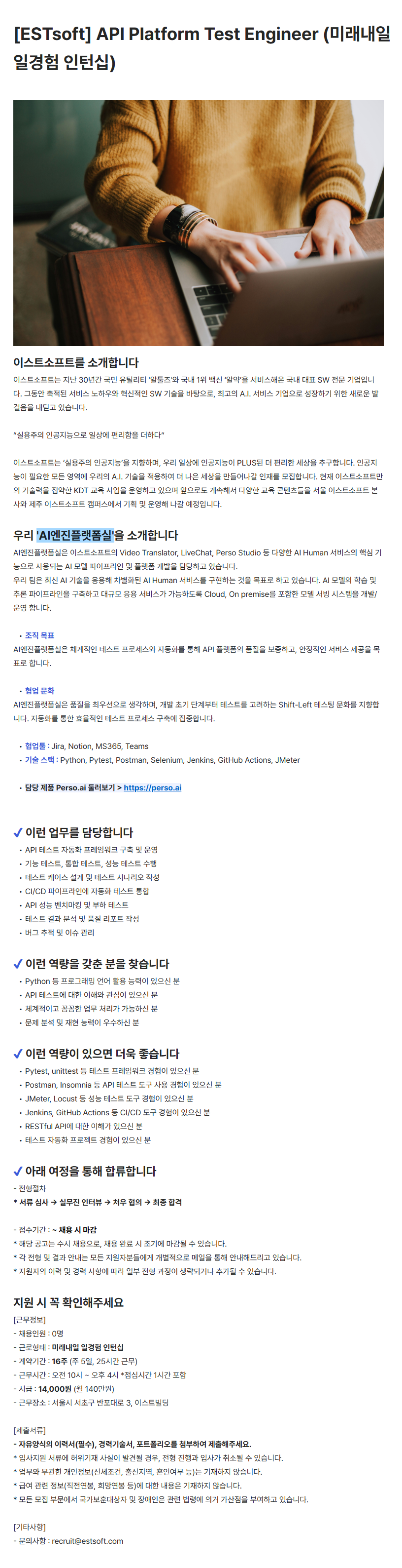 [ESTsoft] API Platform Test Engineer (미래내일일경험 인턴십)