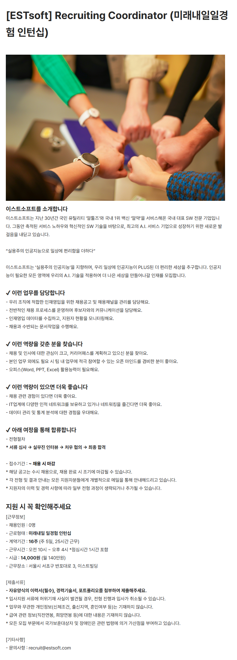 [ESTsoft] Recruiting Coordinator (미래내일일경험 인턴십)