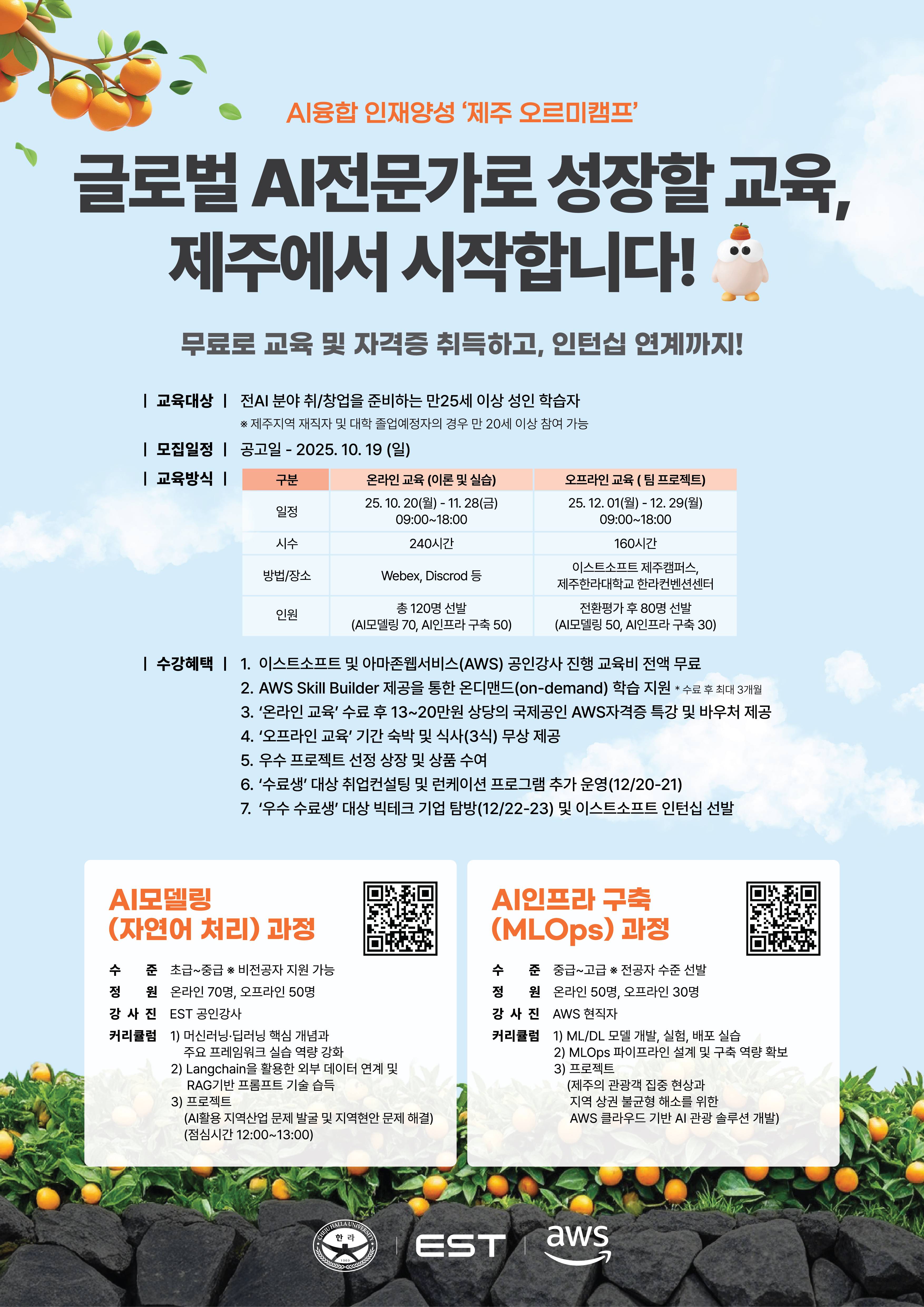 [이스트캠프] AI융합인재 양성 '제주 오르미캠프' 교육생 모집 (~10/19)