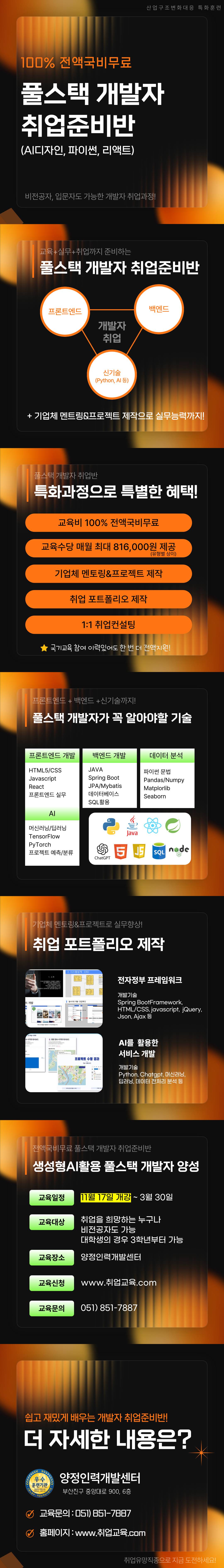 [전액국비무료/취업유망] 풀스택 개발자 취업준비반(AI디자인, 파이썬, 리액트)<생성형AI 기반 풀스택 개발자 양성 (AI디자인·파이썬·리액트)>