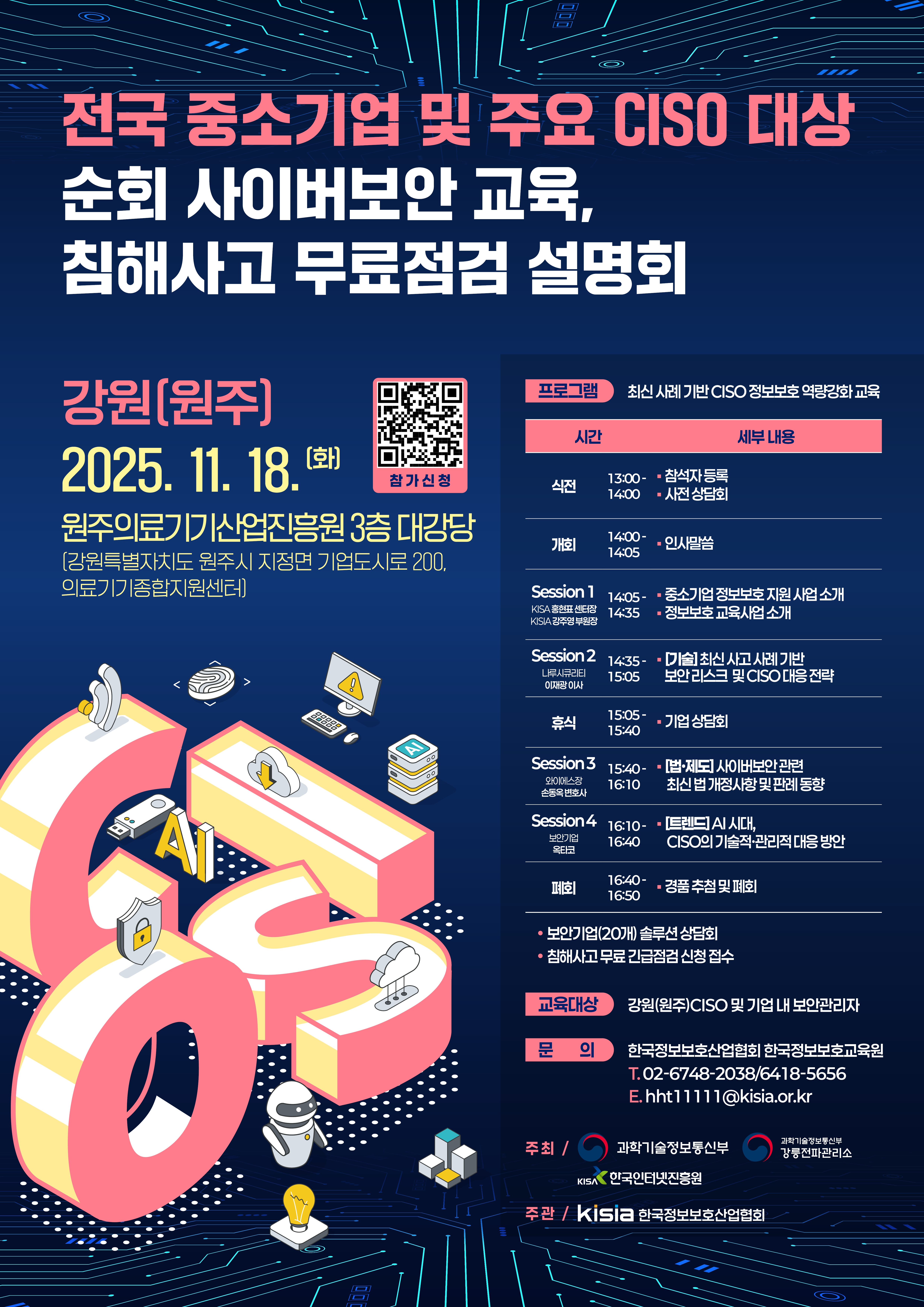 [11월 참가자 모집 중] 전국 중소기업 및 주요 CISO 대상 순회 사이버보안 교육 & 침해사고 무료점검 설명회 - 강원(원주) 지역📢 [11월 참가자 모집 중] 전국 중소기업 및 주요 CISO 대상 순회 사이버보안 교육 & 침해사고 무료점검 설명회 - 강원(원주) 지역