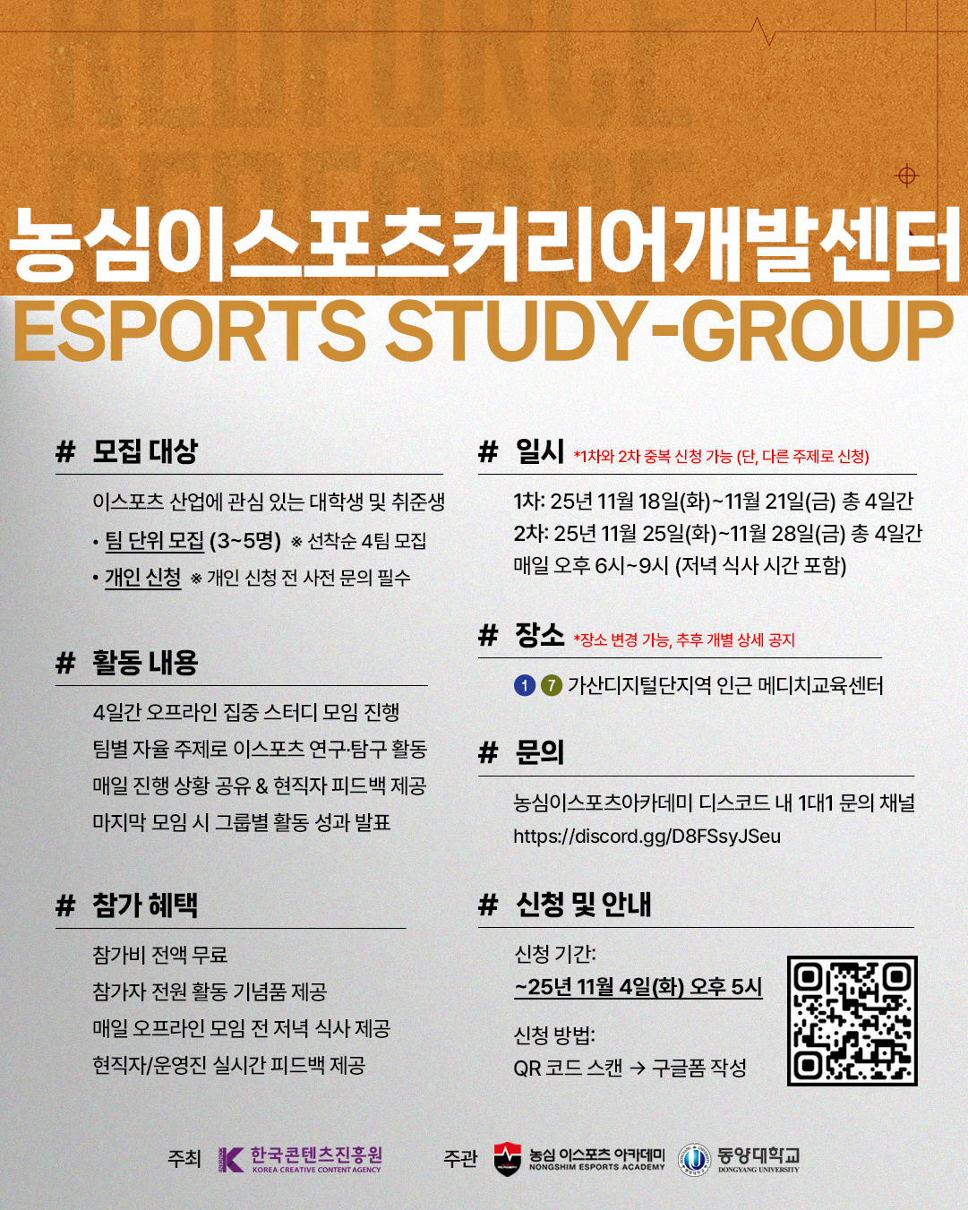 [농심이스포츠커리어개발센터] 11월 이스포츠 스터디그룹 모집!