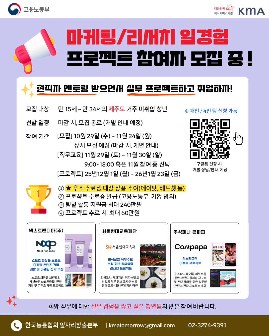 [제주] 마케팅/리서치 일경험 프로젝트 참여자 모집 (~11/24) - 우수 수료생 대상 상품 수여(에어팟, 헤드셋)📢 한국능률협회와 함께 마케팅/리서치 프로젝트에 참여할 청년을 모집합니다.