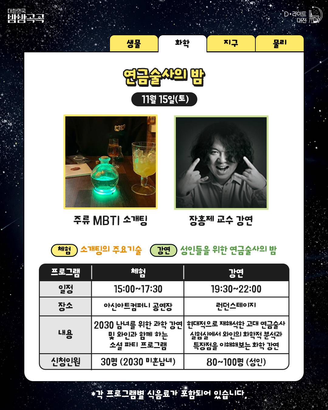 #디라이트 #D라이트 #과학의밤 #대전관광공사 #화학 #장홍제 #화학하악 #광운대 #연금술사 #술 #와인 #주류 #화학콘서트 #성인 #심포지엄 #네트워킹 #파티 #소셜 #카페쿠아 #쿠아 #QUA #과학카페 #아신아트컴퍼니 #MBTI #소개팅 #소셜 #네트워킹 #파티 #쏠이 #과커