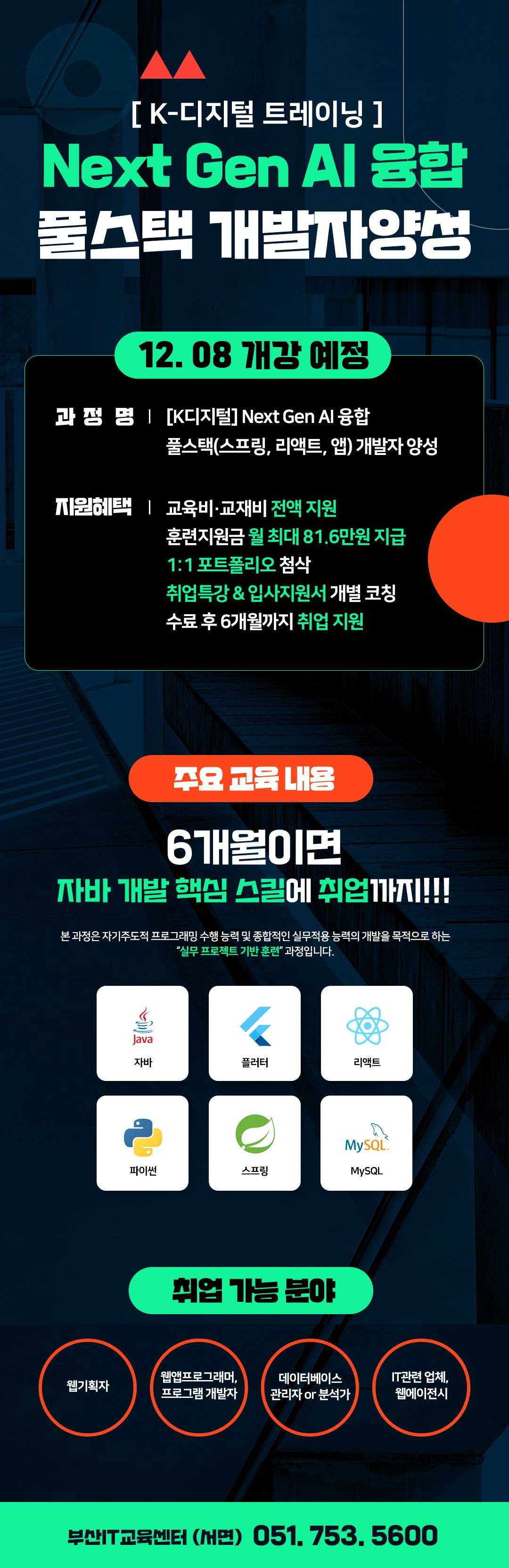 [KDT/전액무료][K디지털] Next Gen AI 융합 풀스택(스프링, 리액트, 앱) 개발자 양성(~12/22)