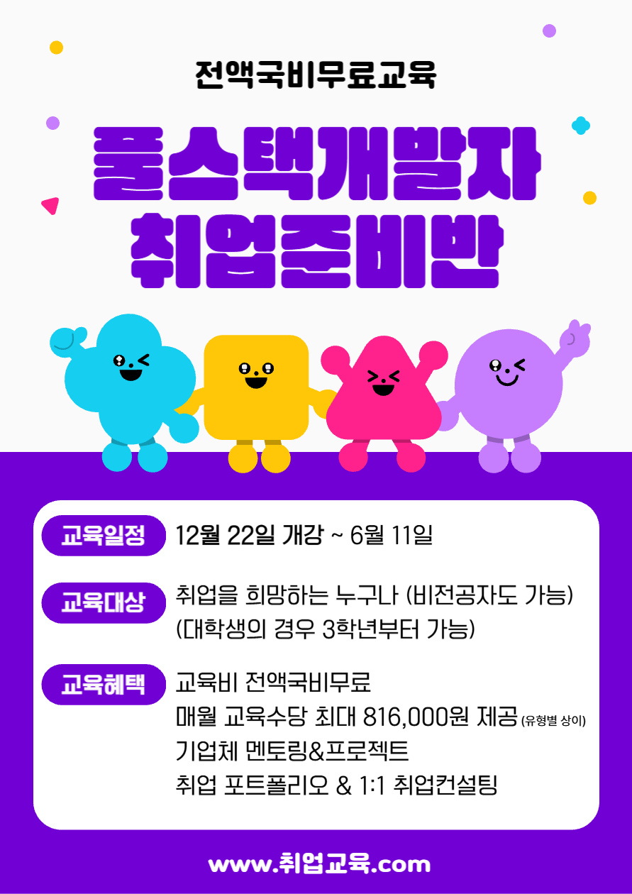 [100%전액국비지원] 취업유망직종 풀스택 개발자 취업준비반빅데이터·AI·파이썬 기반 풀스택 개발자 양성과정