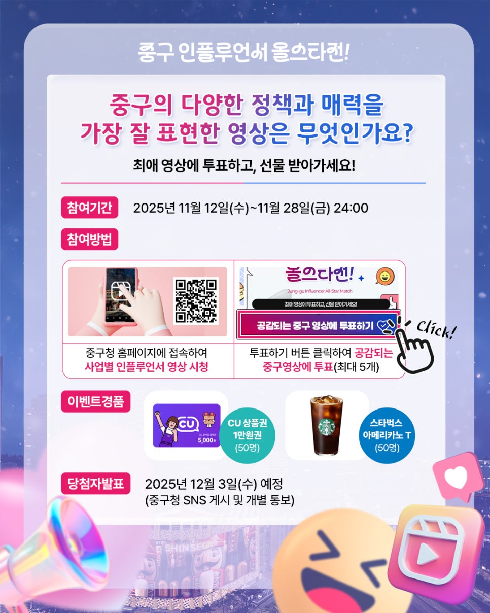 중구의 매력을 뽐낸 ❤️최애 영상❤️에 투표하고, 선물을 받아가세요☺️!!