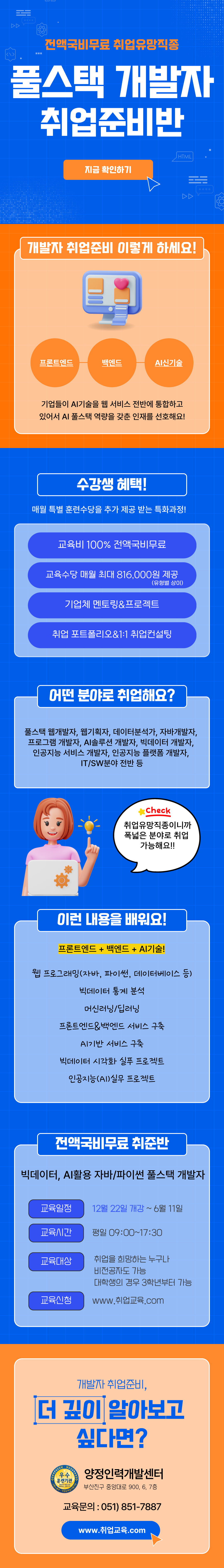 [전액국비지원] 비전공자도 OK! 풀스택개발자 취업준비반빅데이터·AI·파이썬 기반 풀스택 개발자 양성과정