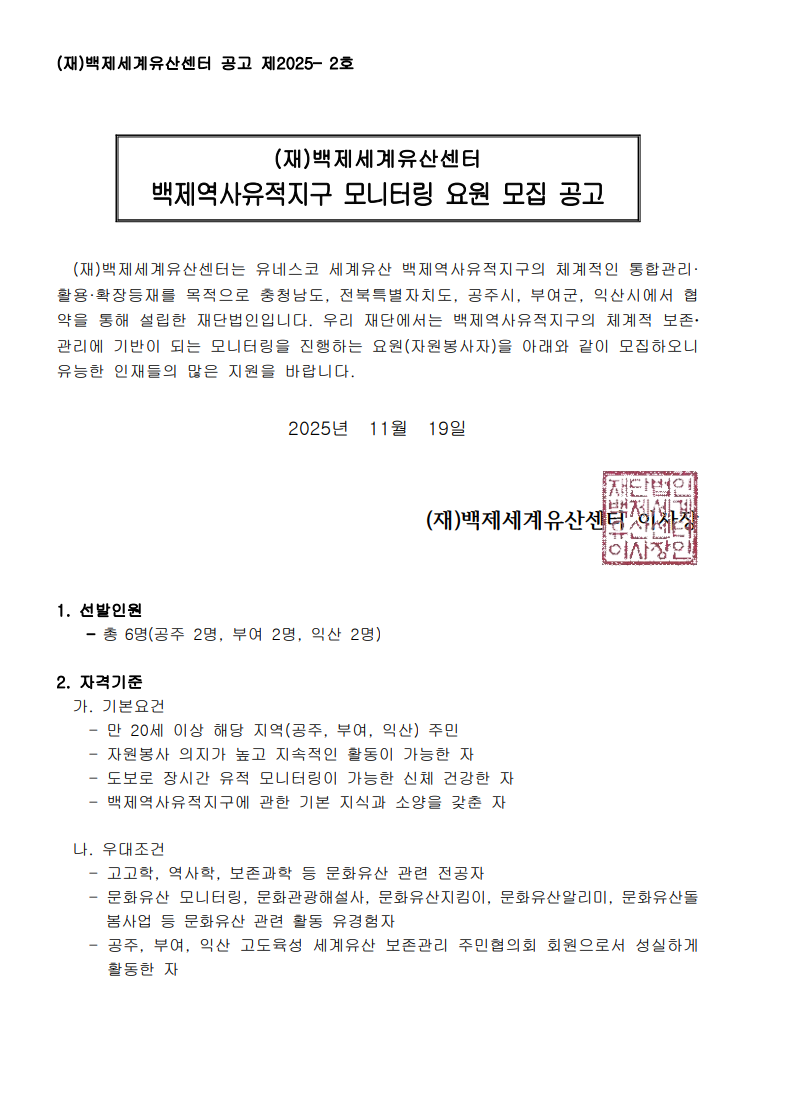 백제역사유적지구 모니터링 요원 모집(재)백제세계유산센터 백제역사유적지구 모니터링 요원 모집