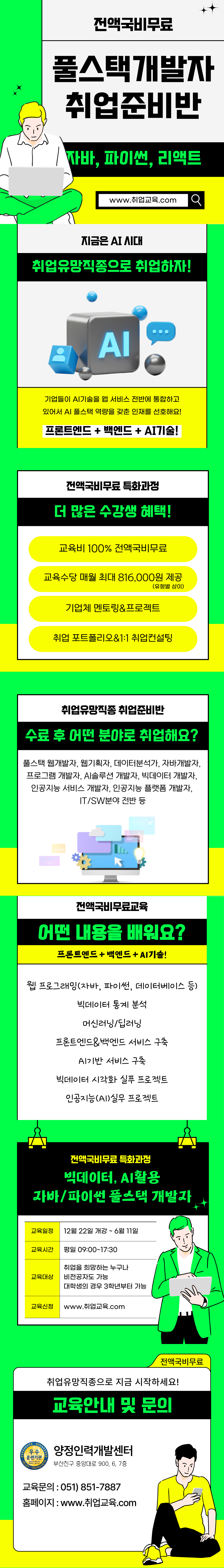 [전액국비무료] 자바, 파이썬, 리액트 풀스택개발자 취업준비반(+기업체 프로젝트 멘토링)빅데이터·AI·파이썬 기반 풀스택 개발자 양성과정