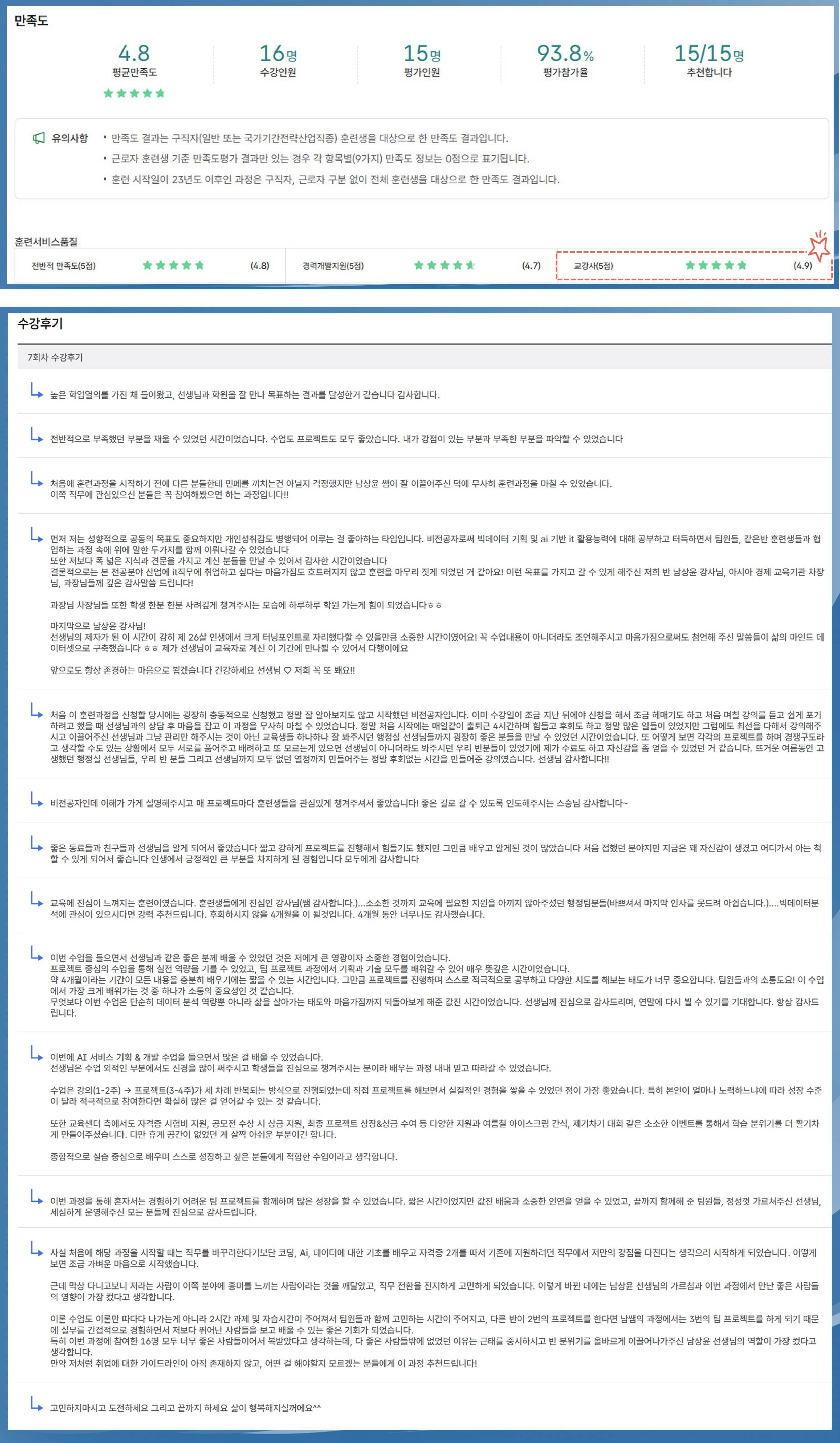 🎓 교강사 만족도(4.9) + 후기 + 수료율 + 취업률 모두 만족시킨 강사&멘토 지도