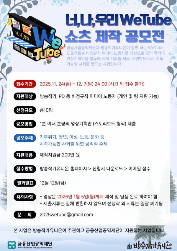 방송작가, PD 등 비정규직 미디어 노동자 (개인 및 팀 지원 가능)