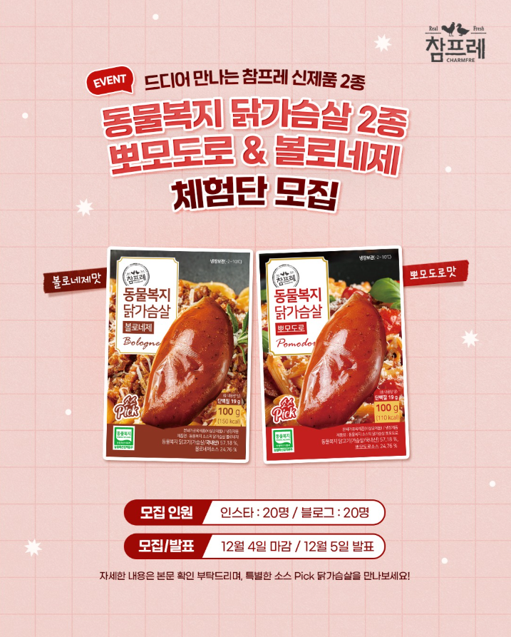 [참프레] 동물복지 닭가슴살 뽀모도로 & 볼로네제 체험단참프레 맛있는 소스 PICK 닭가슴살 2종 체험단을 모집합니다!