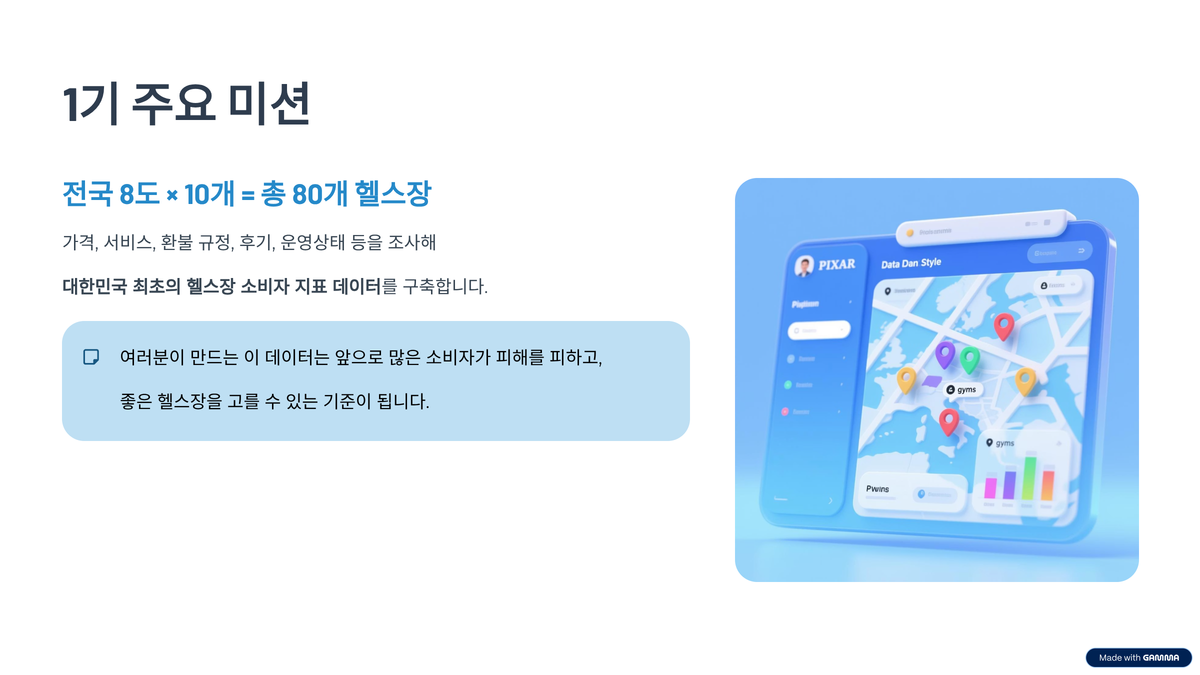 1기는 전국 8도 × 10개 = 총 80개 헬스장의