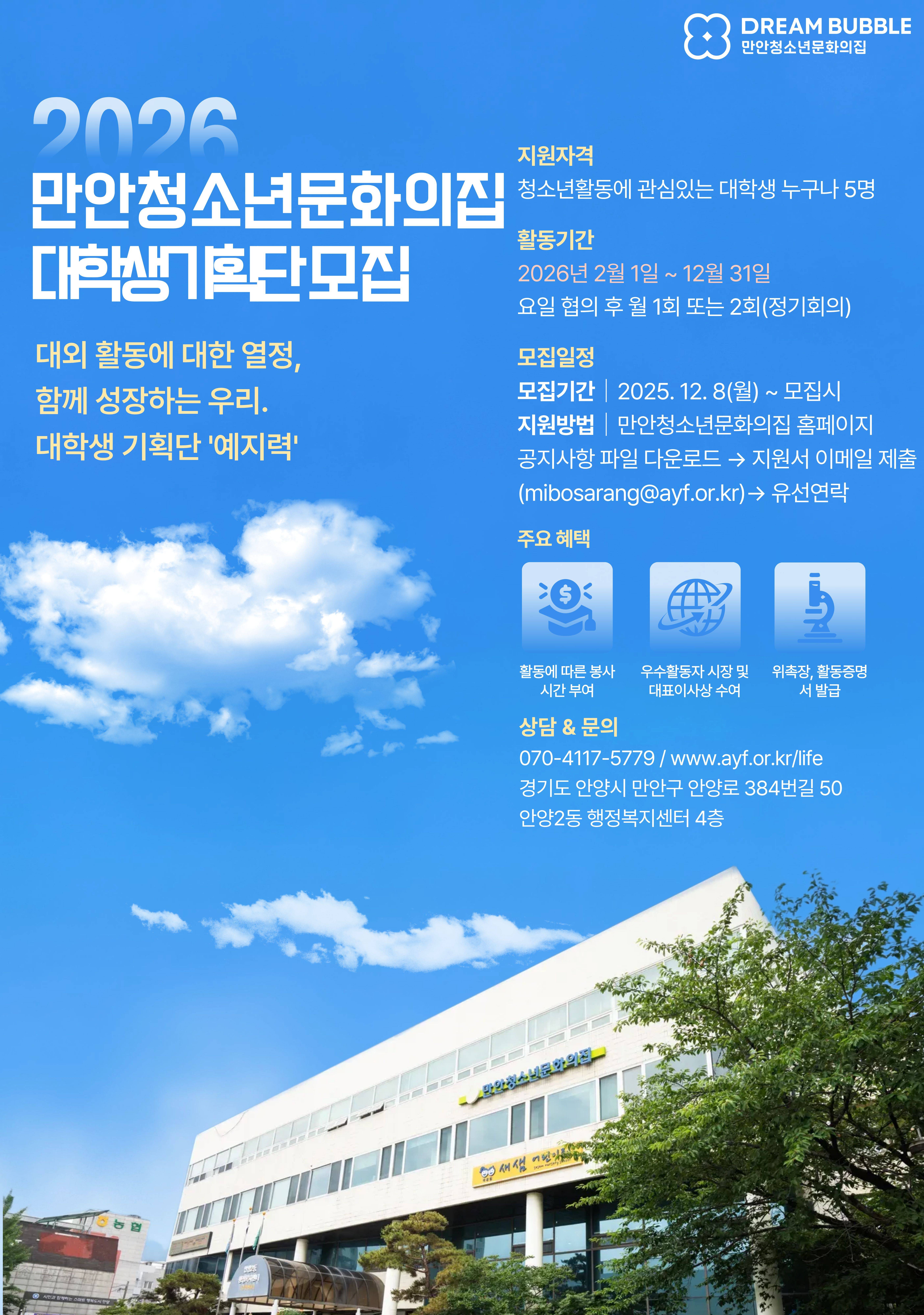 2026년 안양시만안청소년문화의집 대학생기획단 예지력 모집2026년 안양시만안청소년문화의집 대학생기획단 예지력 모집