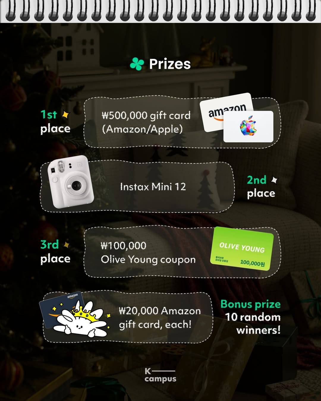 1등 (1명): 50만 원 상당 기프트카드 (애플 혹은 아마존 기프트카드)