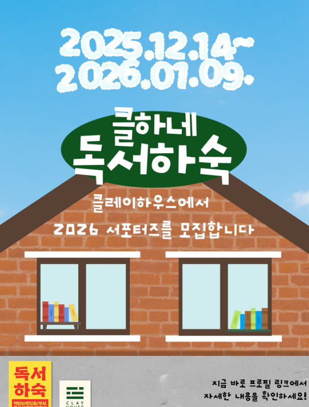 삼시세끼는 어려워도 마음의 양식은 채워드릴 수 있는 클하네 독서 하숙으로 어서오세요~! 2026년 함께할 클레이하우스의 서포터즈를 모집합니다.