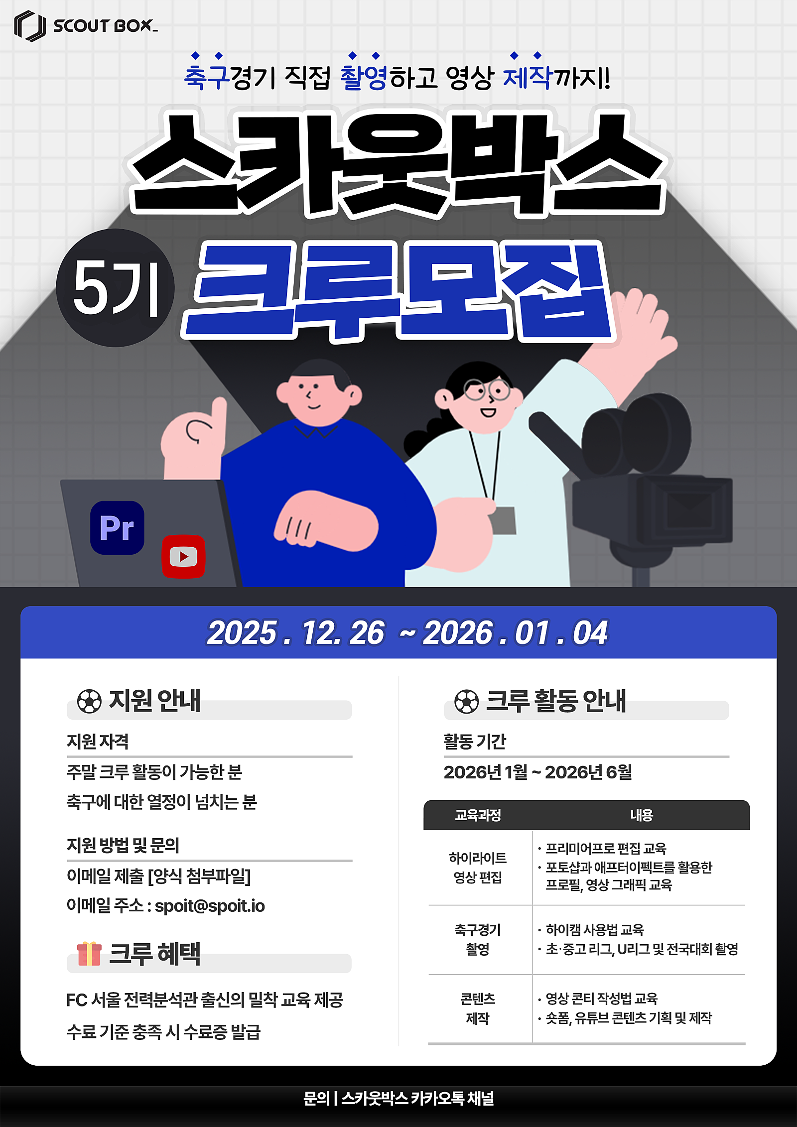 ✅ 스카웃박스(scout box)의 공식 5기 크루를 모집합니다. 스카웃박스의 하이라이트 영상은 스카이뷰로 축구 경기를 촬영한 후 슛, 패스 등 의미있는 움직임을 분석 및 편집한 개인 맞춤형 영상입니다.