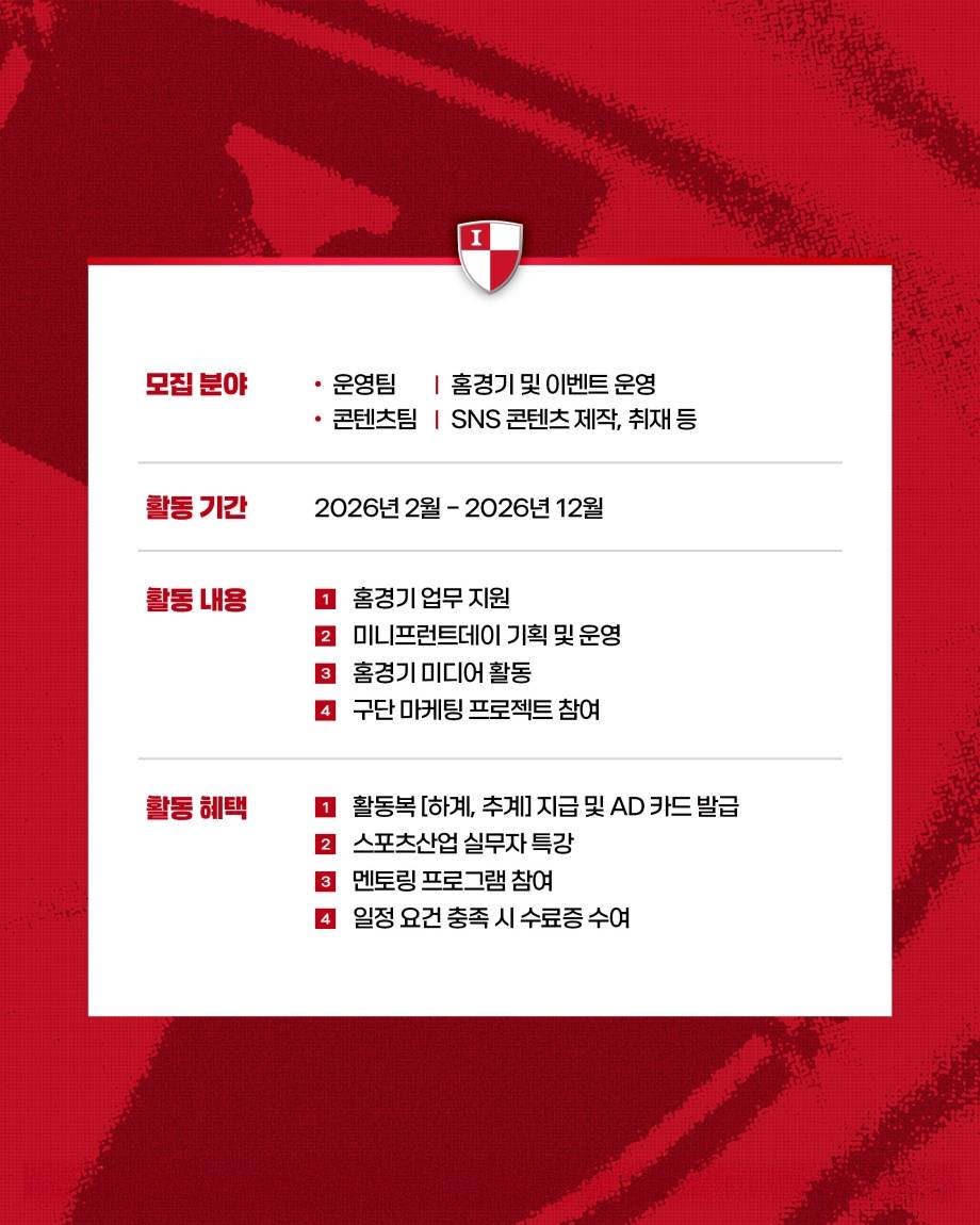 - 운영팀: 지원서/자기소개서, 홈경기 이벤트 기획안(자유양식)