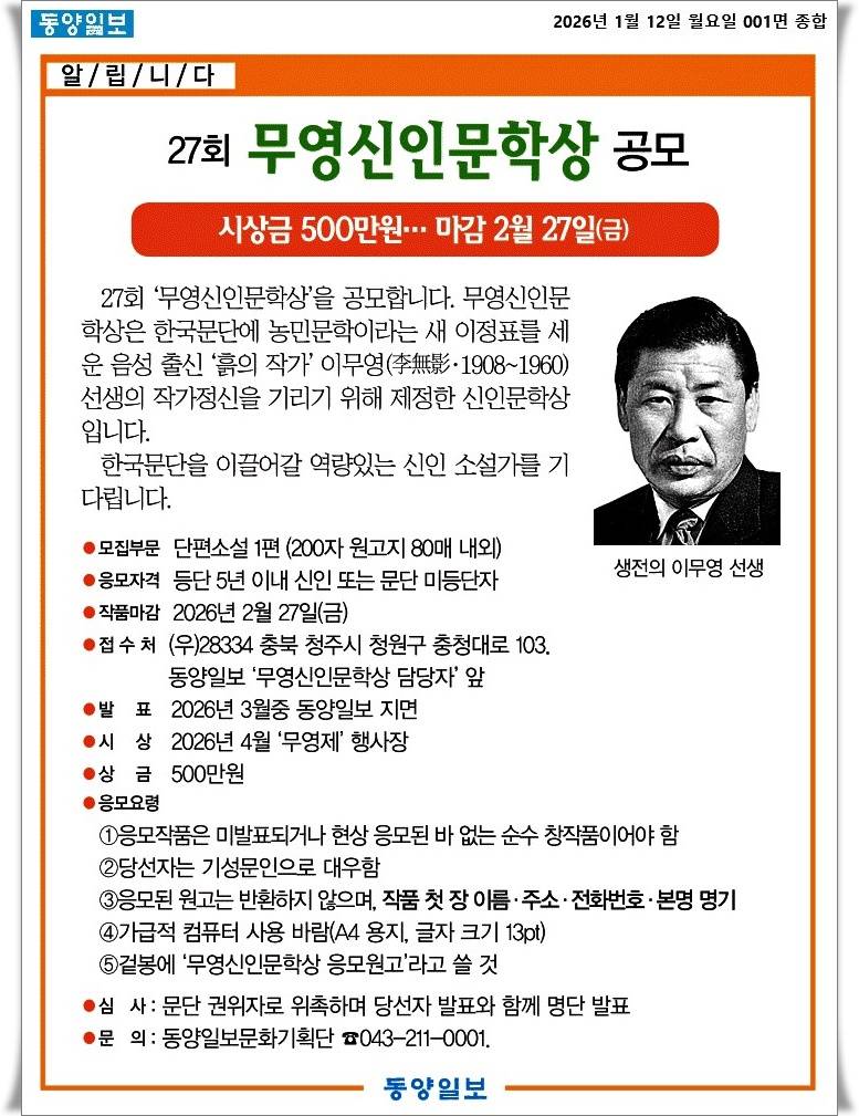 - (우)28334 충북 청주시 청원구 충청대로 103 동양일보 무영신인문학상 담당자 앞