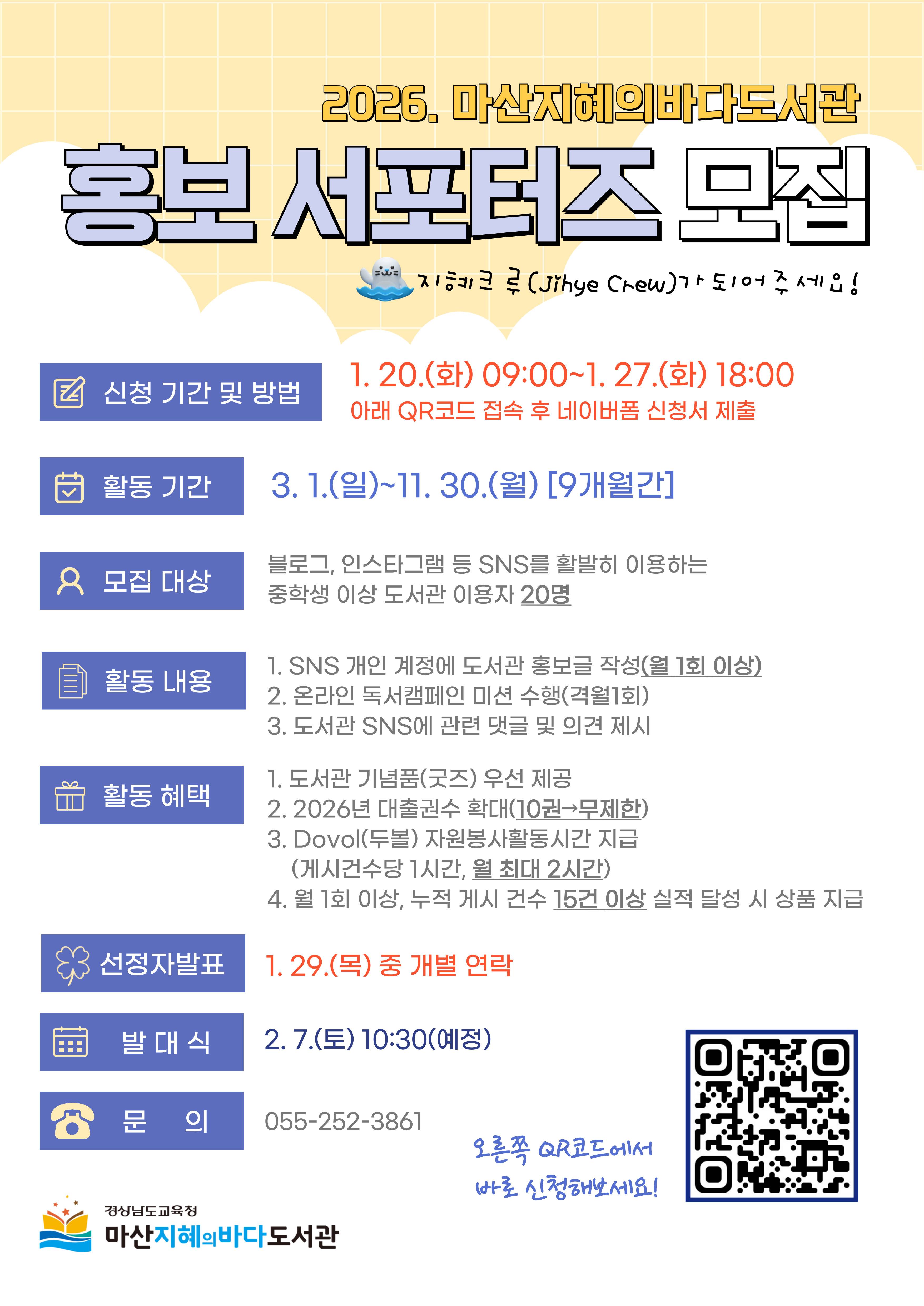2026 마산지혜의바다도서관 홍보 서포터즈 지혜크루 모집2026 마산지혜의바다도서관 홍보 서포터즈 지혜크루 모집