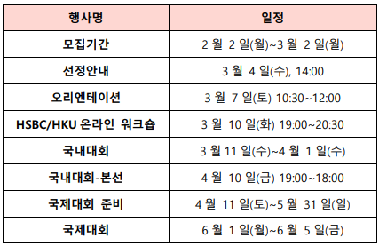- (오프라인) 국제대회: 국내대회 우승팀은 국가 및 학교 대표로 HSBC/HKU