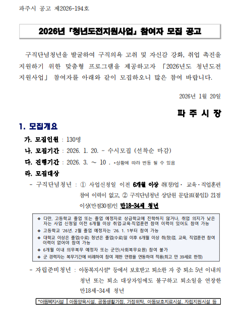 2026년 파주시 청년도전 지원사업 참여자를 아래와 같이 모집 공고합니다.