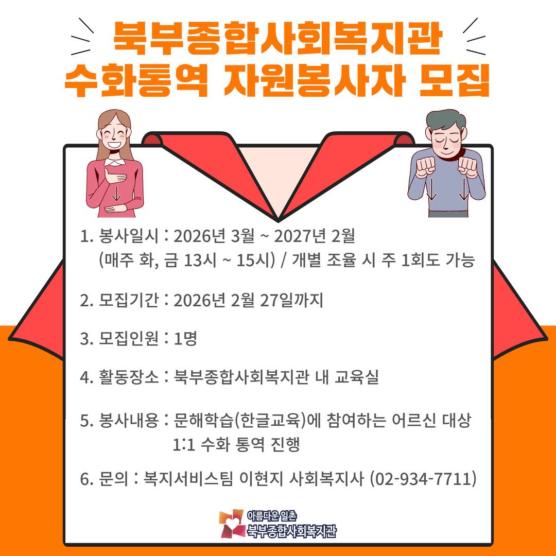 북부종합사회복지관 수화통역 자원봉사자 모집북부종합사회복지관 수화통역 자원봉사자 모집