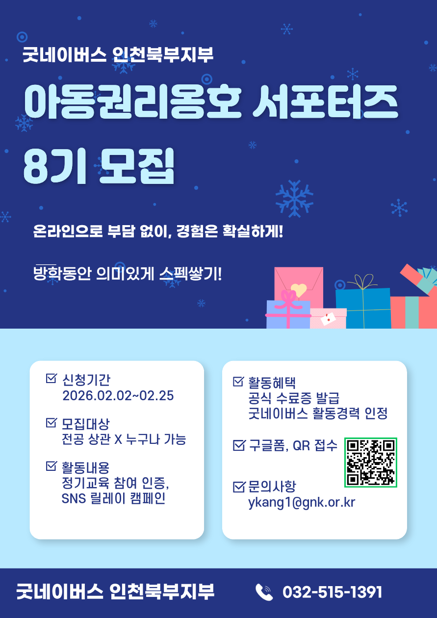 안녕하세요! 저희 굿네이버스 인천북부지부에서 아동권리 옹호에 관심을 갖고 함께 활동해나갈 서포터즈를 모집합니다. 모든 아동들이 당연히 누려야 할 권리를 가지는 세상을 위하여 동참해주세요.